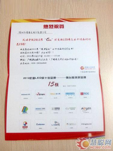 2012年11月27日,由慧聪主办的“LED显示行业十佳品牌专家评审会”在深圳举办,灵信作为前15强入选品牌参加此次会议,华南分公司张经理代表灵信出席。期间给评审团以及各参会嘉宾介绍了公司的最新产品,对全彩异步显示