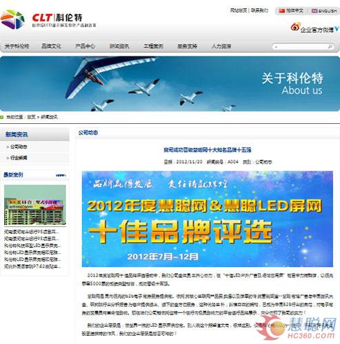 慧聪LED屏网11月21日报道 2012年11月20日00:00分,2012年度慧聪网LED屏行业十佳评选15强尘埃落定。在获悉入选的第一时间,深圳科伦特科技有限公司在其公司官方网站发布了入选的新闻。