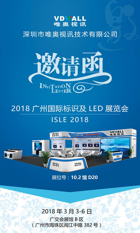 慧聪LED屏网报道 2018年3月3至6日,\"2018ISLE广州国际广告标识及LED展览会\"即将开幕。作为国内LED显示屏视频图像处理设备的创领品牌,唯奥视讯在本届展会上将有多款新品推出,期待您的莅临唯奥10.2D20展台参观、指