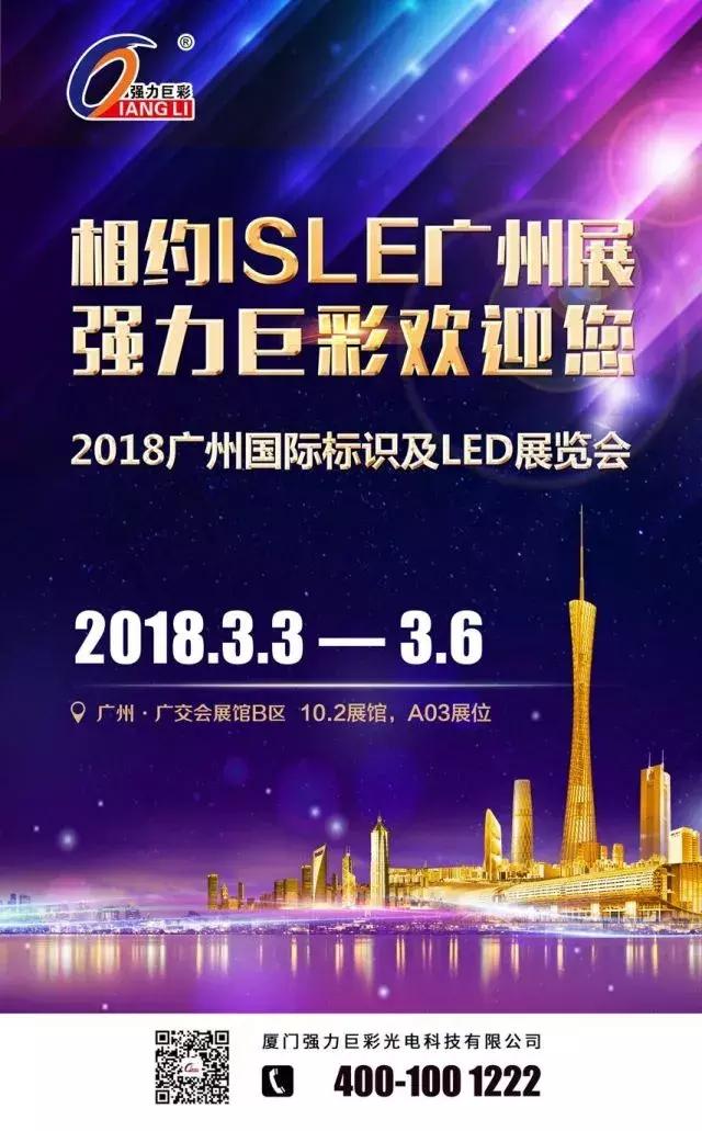 慧聪LED屏网报道 2018广州国际广告标识及LED展览会暨广州国际大屏幕显示技术与应用展览会(简称“ISLE”)将于2018年3月3-6日在广州广交会展馆B区举行,本次展览面积达12000㎡,约1600家知名企业参展,预计届时将吸引数