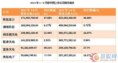 2012年LED显示屏上市公司业绩排名(1-9月)