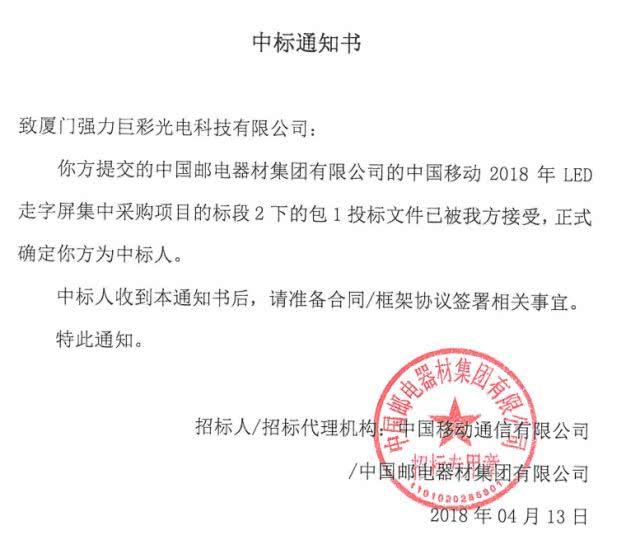 慧聪LED屏网报道 中国移动2018年全国LED显示屏采购项目最大标段、最大金额的小间距标段争夺战中,强力巨彩小间距产品最终独占70%中标份额,中标总金额近亿元!目前整个项目已陆续实施,Q Pro小间距产品有条不紊的出货