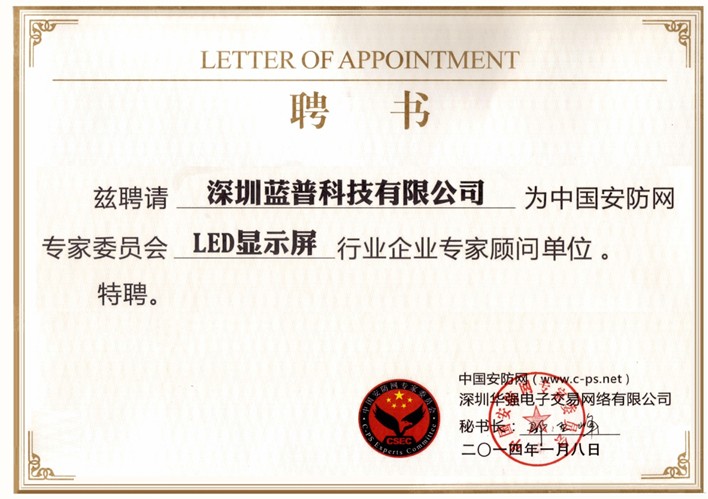 新春伊始,万象更新。蓝普科技在2014年到来之际,率先加入了由中国安防网组织的“LED显示屏行业企业专家委员会”,蓝普科技产品总监戴志明先生被聘请为中国安防网专家委员会“安防技术专家顾问”。