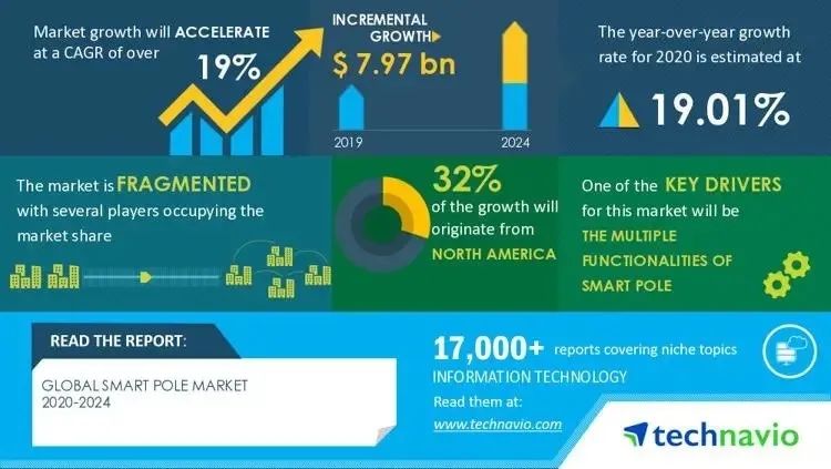 慧聪LED屏网报道 据Technavio研究报告显示,预计2020-2024年,全球智能杆市场规模预计将增长79.7亿美元。