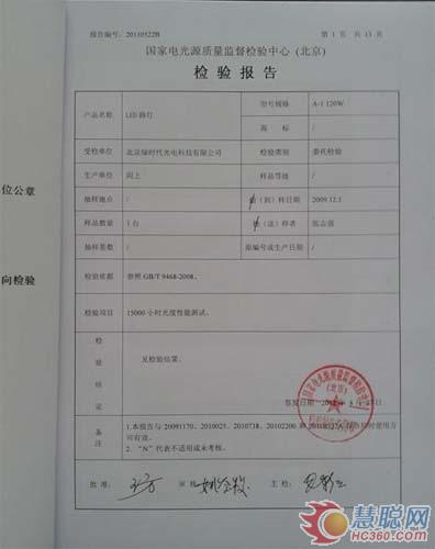 慧聪LED屏网5月16日报道 近日北京绿时代光电科技有限公司又获喜讯,自09年送检的120WLED路灯经国家电光源质量监督检验中心(北京)连续检测,15000小时继续无光衰。从2009年12月到2012年5月,检验报告共分为如下几个阶
