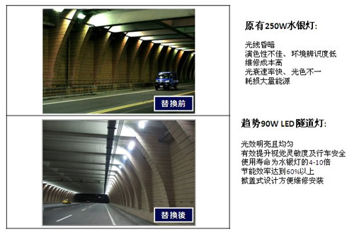 趋势照明股份有限公司于2011年10月接获400盏LED隧道灯订单,日前完工后已顺利通过业主验收。做为台湾三大LED路灯厂之一的趋势照明,暨2009年二航厦路灯汰换工程之后,再一次协助桃园国际机场达到高效节能目标。