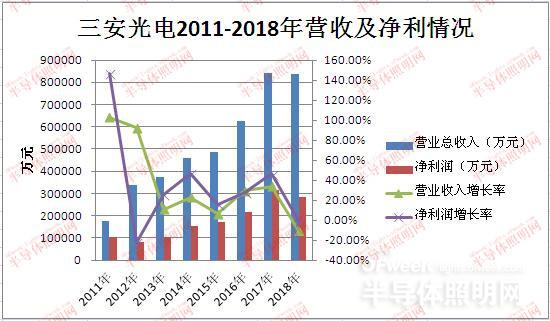 慧聪LED屏网报道 2018年,三安光电实现营业收入83.64亿元,同比下降0.35%;归属于母公司股东的净利润为28.30亿元,同比下降10.56%;归属于母公司股东权益为212.49亿元。