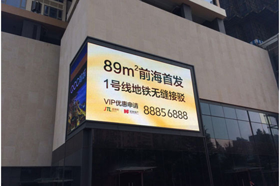 慧聪LED屏网报道 近日,由洲明科技为前城滨海花园01地块打造的产品型号为S10,面积为86.4㎡的新一代超轻超薄户外广告屏成功点亮,其紧贴墙面90°转角的设计结构,配合高清细腻的画面显示效果,使得前城滨海花园01地块