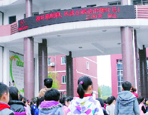 在金华市金东区实验小学,不少学生早上走进校门,总会抬头看一看正中教学楼三楼的位置。那里挂着一块黑色的LED屏,一年半以来这里每天都会打出一句充满温情的话。