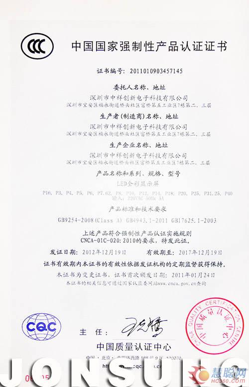 近日,深圳市中祥创新电子科技有限公司顺利通过中国质量认证中心的强制性产品认证年度监督审查并收到3C升级版认证证书,中祥创新LED显示屏产品成业内首家通过海拔5000米以下以及高热地区的3C认证企业。