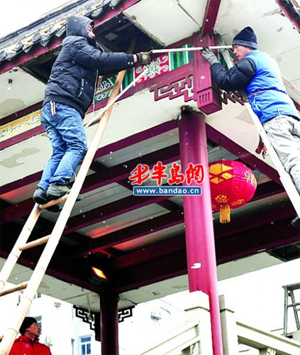 糖球广场上竖起了LED大屏幕,杭州路过街天桥上也装上了长达五百米的跳闪灯,嘉禾路、遵化路两条小吃街上的摊位也在紧张搭建中…… 虽然海云庵糖球会要到2月7日才正式开幕,但1月30日上午,记者来到会场时,工人师傅们