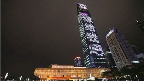 .2011年11月11日被时下未婚男女视为光棍节,在此前夕,位痴情男在深圳第一高楼京基100大厦外墙的LED打上10个巨大的五彩字:郑姗姗,我爱你,嫁给我吧!”,引得路人纷纷观看!
