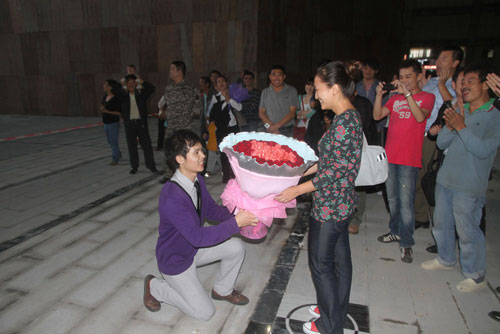 随着海南最大的LED屏播出女友日常生活的靓照,男主角叶先生手捧一大束玫瑰花,缓缓走到女友徐小姐跟前,当着众多市民的面,单腿跪下献上玫瑰花,并大声说出“嫁给我吧!我爱你一生一世。”女友徐小姐满脸幸福地答应了