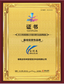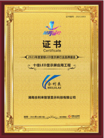 湖南合利来智慧显示科技有限公司荣获国际级高新技术企业证书,产品荣获CCC认证、节能认证,并荣获2021年度最佳投资性品牌和2021年度十佳LED显示屏应用工程。