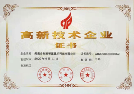 2020年9月:荣获高新技术企业证书。同年成为湖南省怀华市LED全彩显示屏智能化应用(合利来)工程技术研究中心。