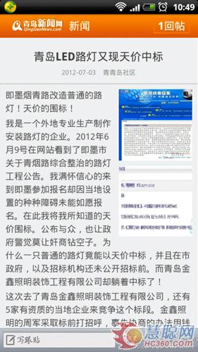 近日,慧聪LED屏网在其微博上看到一条名为“情绪疯子”的网友发帖称,青岛即墨市烟青路改造普通的路灯时,惊现天价围标。该网友举报称,青岛金鑫照明装饰工程有限公司在几个月前中标的即墨市烟青路项目中存在涉嫌高价