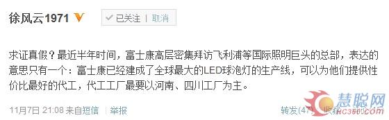 11月7日晚,雷士照明控股有限公司前副总裁徐风云发表微博,关于富士康是否将为飞利浦等照明巨头代工求证网友,该微博引起热烈讨论。