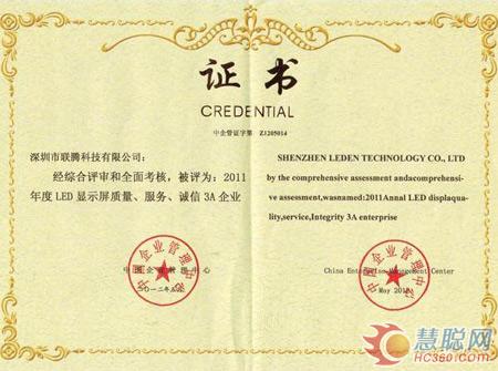 联腾科技荣膺“2011年度LED显示屏3A企业”称号