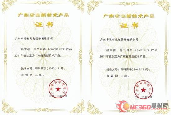 慧聪LED屏网3月15日报道日前,广东省科技厅公布了2011年高新技术产品认定结果,鸿利光电公司的POWERLED和LAMPLED均被认定为广东省高新技术产品。截至目前,鸿利光电的SMDLED、POWERLED、LAMPLED三大系列产品均通过了