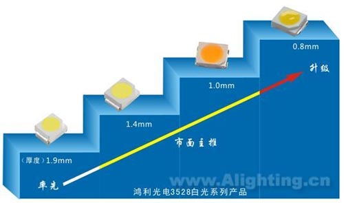 鸿利光电于近日推出新一代3528-080.7W扁平结构白光产品,是继该公司推出1.4mm与1.0mm的3528之后第三代的优势白光光源。