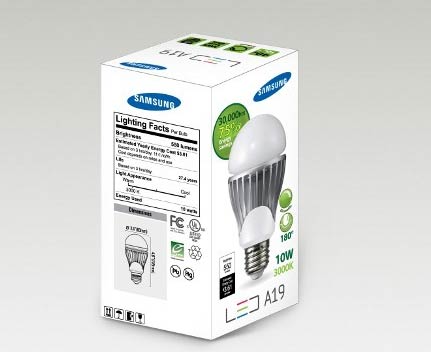 现在来自韩国大厂三星日前也拿出了自己最好的LED灯泡,并且一推出就是10瓦大功率LED灯泡。这款名称为SamsungLEDA19的LED灯泡,光能转换效率75%,寿命标为3万个小时,发光角度为180度。色温为3000K暖白光的光通量为5