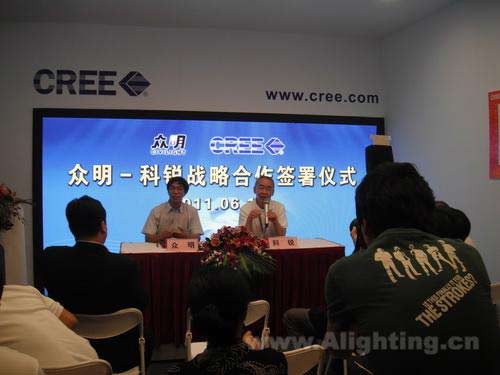 6月10日,参加2011广州国际照明展览会的科锐在展馆内与深圳众明半导体照明有限公司举行战略合作签署仪式,共同发展LED照明产业。