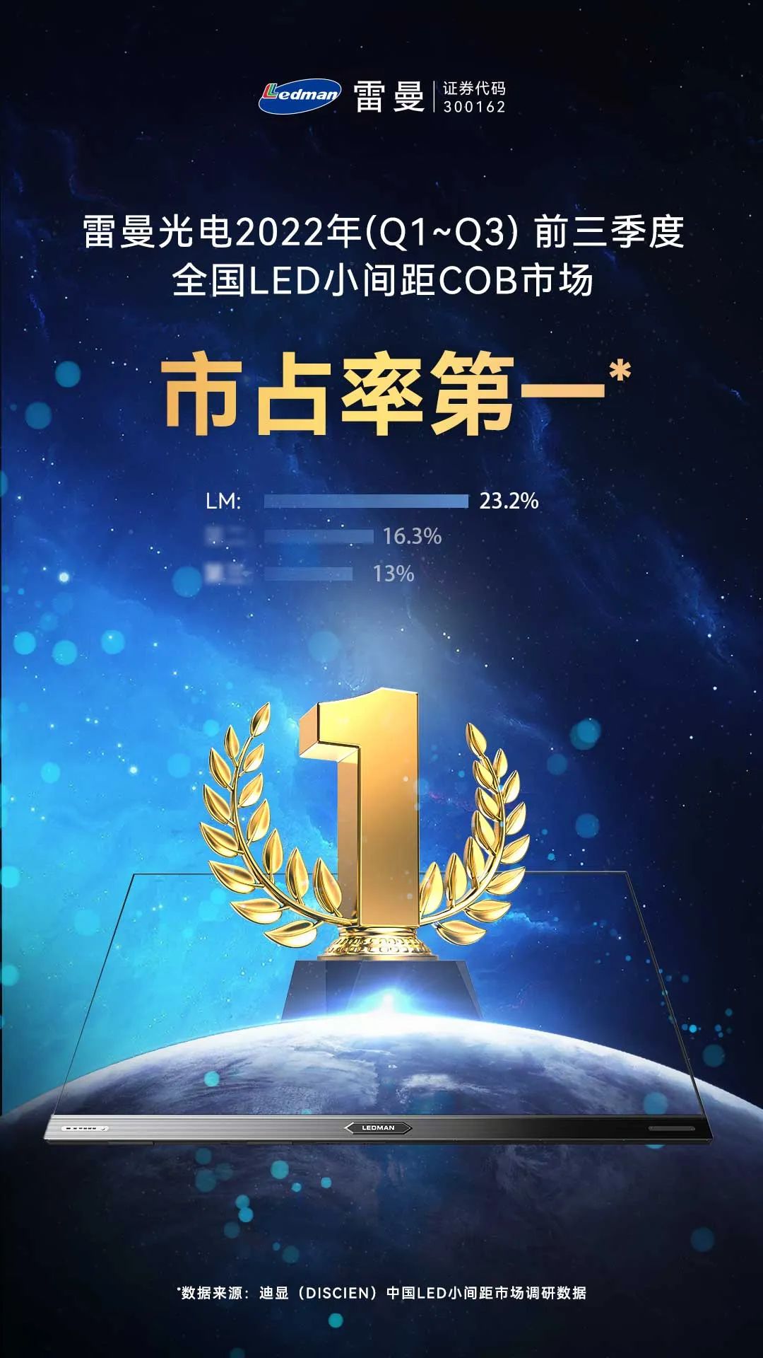 根据迪显中国LED小间距市场调研数据显示,在中国大陆地区LED小间距COB市场,雷曼2022年(Q1-Q3)前三季度销售额&销售量均位居行业第一。目前雷曼在COB细分领域的市场占有率继续稳居第一。