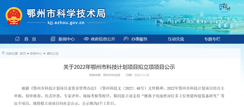 11月30日,湖北省鄂州市科学技术局发布《关于2022年科技计划项目拟立项项目公示》的公告,共计51家企业的项目入选