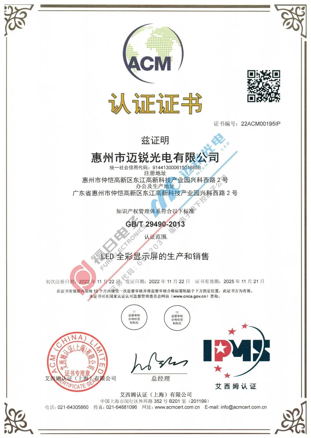 迈锐光电成功通过 GB/T 29490-2013 知识产权管理体系认证