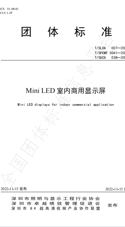 日前,深圳市照明与显示工程行业协会发布了《Mini LED室内商用显示屏》团体标准,标准编号为T/SLDA 007—2022,发布日期为2022年11月15日,自2022年11月15日起正式实施。值得注意的是,视爵光旭作为主要起草单位,参与编写《Mini LED室内商用显示屏》团体标准。