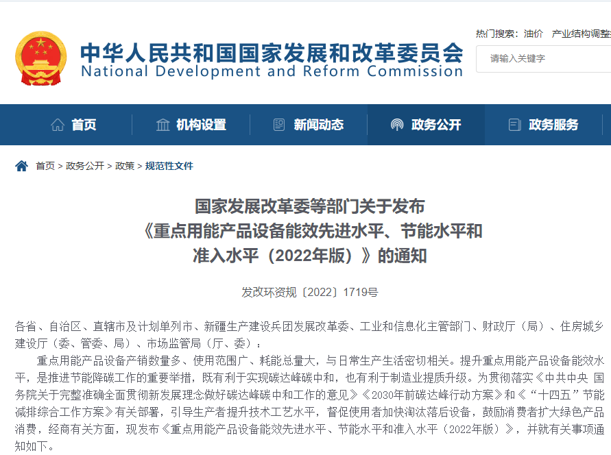 近日,国家发展改革委、工业和信息化部、财政部、住房城乡建设部、市场监管总局联合发布了《重点用能产品设备能效先进水平、节能水平和准入水平(2022年版)》的通知(以下简称《通知》)。