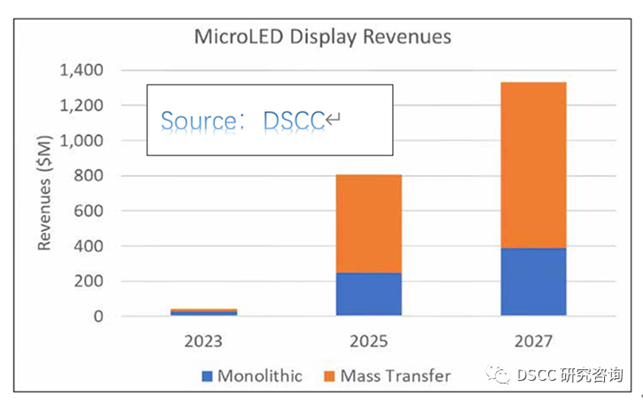 11月14日消息,据DSCC机构最 新发布的《MicroLED显示技术和市场前景报告》,Micro-LED显示的市场仍然很小,但预计到2027年将达到13亿美元规模。在Micro-LED能够与其他技术竞争之前,降低制造成本将是必要的,如OLED。