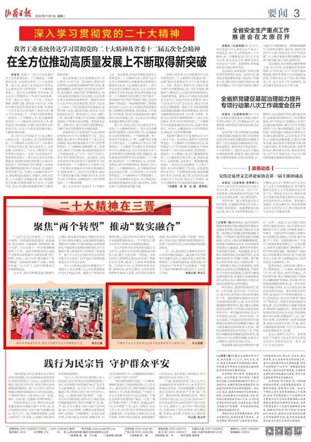 2022年11月1日《山西日报》第三版以二十大精神在三晋聚焦“两个转型” 推动“数实融合”为题,报道高科华烨集团,以LED产业转型发展和数字化转型发展“两个转型”为核心,奋力实现“数实融合、数智赋能”,加快推动LED产业驶上智能快车道。