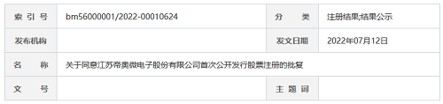 根据证监会发布的消息,江苏帝奥微电子股份有限公司(以下简称:帝奥微)首次公开发行股票的注册申请已获同意。