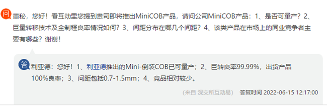 集微网消息,6月15日,利亚德在投资者互动平台上表示,利亚德推出的Mini-倒装COB已可量产。