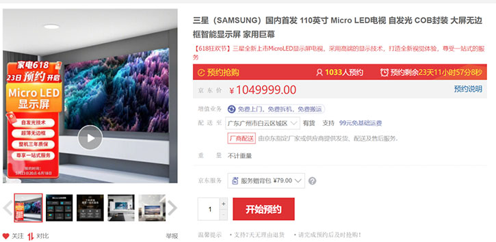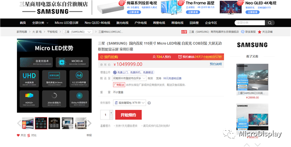 5月25日消息,从三星商用电器京东自营旗舰店获悉,今日,三星110英寸MicroLED电视正式上架并开启预约,售价1049999元。