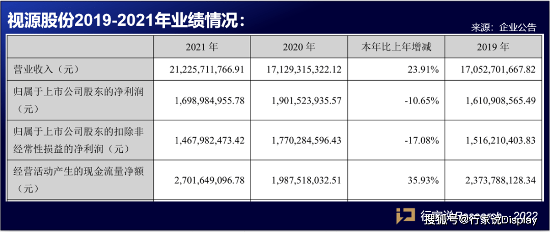 4月20日,视源股份发布了2021年年度业绩报告。 2021年,视源股份实现营业收入212.26亿元,同比增长23.91%,实现归属于上市公司股东的净利润16.99亿元,同比下降10.65%,实现扣除非经常性损益后的归属于上市公司股东的