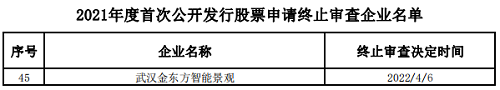 根据证监会在4月8日公布的《首次公开发行股票审核工作流程及申请企业情况》,武汉金东方智能景观股份有限公司(以下简称:金东方)首次公开发行股票申请已终止。