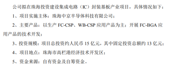 2月28日,中京电子(002579)发布公告,公司于2022年2月28日召开第五届董事会第二次会议,审议通过《关于投资建设珠海集成电路(IC)封装基板产业项目的议案》,公司拟以自有资金及自筹资金人民币15亿元用于珠海集成