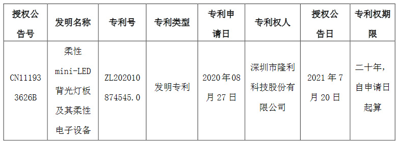 20日,隆利科技发布公告宣布,公司于2021年7月20日收到由国家知识产权局颁发的一项MiniLED相关发明专利证书。