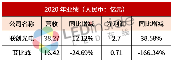 近日,艾比森及联创光电相继发布2020年业绩。净利润方面,前者同比减少,后者同比增长。