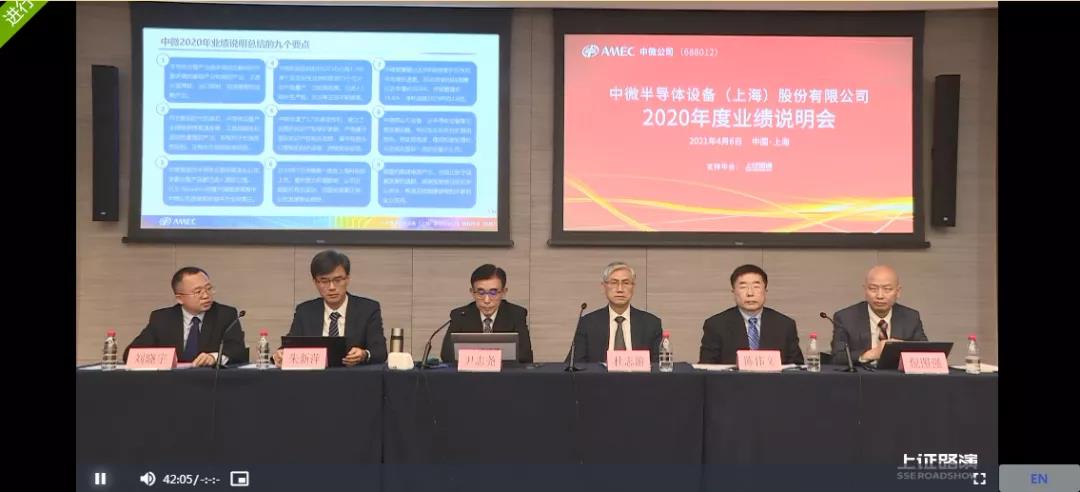 4月6日上午,中微公司就2020年度业绩举行说明会。中微公司董事长&总经理尹志尧、董事&副总经理杜志游、财务负责人&副总经理陈伟文等多位高管亮相说明会。