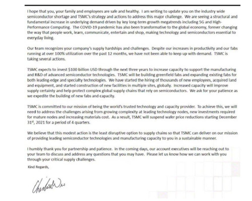 重磅,台积电魏哲家亲笔信曝光!涉及未来投资及晶圆价格等
