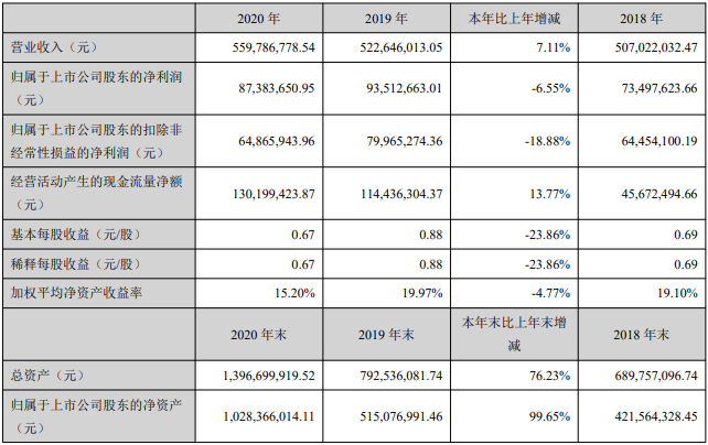 2020年净利润约8738万元 昨(30)日晚间,芯瑞达披露2020年年报。报告期内,公司实现营业收入5.6亿元,同比增长7.11%;归属于上市公司股东的净利润8738万元,同比减少6.55%。公司年度拟每10股转增3股并派发现金红利3元(