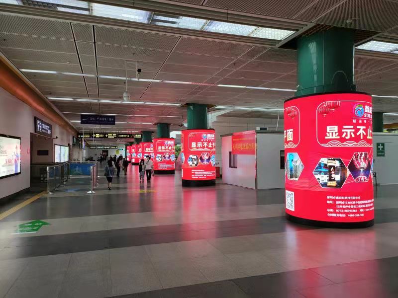 乘客们,前方鑫彩晨柔性圆柱屏已到达罗湖火车站