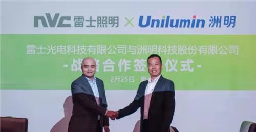 2月25日,雷士照明与洲明科技在雷士照明惠州总部举行战略合作签约仪式,宣布双方在产品研发和渠道资源的整合和共享达成战略合作。雷士照明CEO林良琦与洲明科技董事长林洺锋以及双方团队出席签约仪式。