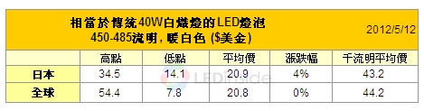 根据TrendForce旗下研究部门LED inside最新LED灯泡零售价调查显示,2012年5月,全球LED灯泡零售价基本维持稳定,浮动幅度较小。取代40瓦白炽灯泡产品价格整体无明显变化,各地区原有商品价格均维持稳定或小幅下滑,而