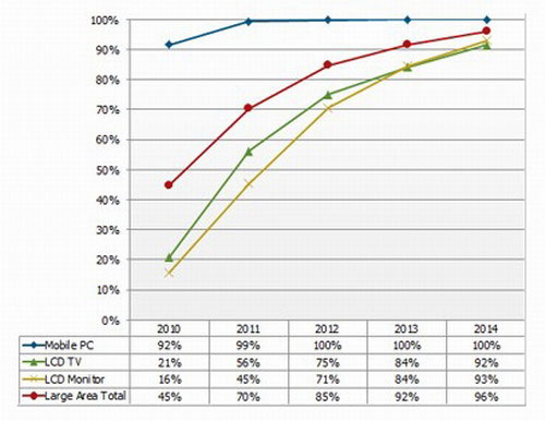 市场研究机构DisplaySearch近日发布季度供求市场预测,DisplaySearch预测电视背光用LED占据多半LED市场的情况将延续至2013年,之后照明应用将成为LED主要市场。这一转变的原因将主要归结为LED的光效提高和成本下降,