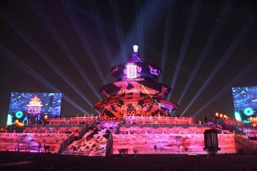 12月31日18时30分,无数的灯彩光柱点亮了天坛圜丘,将圜丘变成了一个巨大的虚拟计时钟,时针一分一秒走向新年。与此同时,从圜丘到祈年殿一路,电脑灯、探照灯、场面LED大屏幕依次亮起,用不同的颜色装饰着古老的建筑