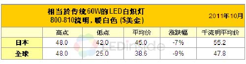 集邦科技(Trend Force)旗下研究部门LED inside的资料,在2011年10月份的灯泡价格调查中发现,取代传统60瓦(W)白炽灯泡的LED灯泡价格明显下滑,单月下滑达9%,尤其在美国地区,其下滑幅度更达10%,平均零售价来到38